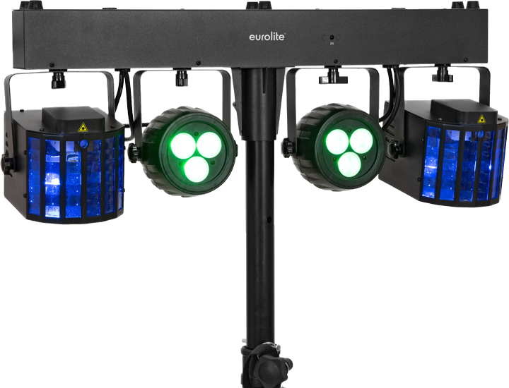 Besoin de lumières ? Je vous conseille le set de lumières tout-en-un Eurolite (pied, télécommande, 2 leds fixes et 2 derbys mobiles, 2 exemplaires disponibles à la location).